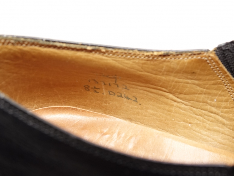 こちらは旧グリーン製の商品ですが、かなり古目の時代の商品の様で、ラストも242という木型を使い、ライニングの字体や表記方法(3段の表記の配列)も昔のスタイルなのと、ヒールもラバー無しの釘のみです。