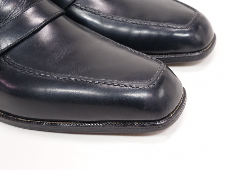 チゼルトゥが有名なジョージ・クレバリーですが、アンソニー・クレバリーの靴はジョージ・クレバリーの靴に比べると同じく特徴的なトゥ周りの形をしていますが、ソールステッチの幅も非常に細かく、コバのせり出しも少なめにしてあるので、全体的に華奢で貴族的な雰囲気をしており、無骨な英国靴というよりもベルルッティ、コルテ、オーベルシーの様なフランス靴に印象が近い靴ですね。(アンソニー・クレバリーとオーベルシーの逸話は有名ですしね!!)