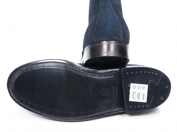 こちらも大変希少なオールデンで、ネイビースエードだけでも珍しいのですが、ソールがレザーソールです。インディーは大体、コルクやコマンドのソールが多くゴツメな印象ですが、ソールがレザーだとコバのせり出しが少なく、ソールも薄くなるのでスマートな印象の一足です。