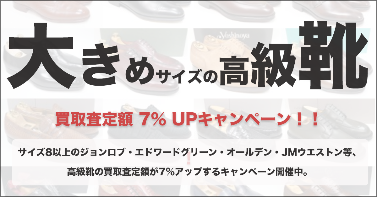 そこで、今回は大きめサイズの靴を沢山集めようと思い、サイズ8以上の靴(EUサイズは42以上)が通常の査定額に加えて7%が上乗せとなる買取キャンペーンを開催します。